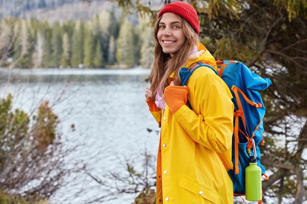 Wähle ein Volumen, das Schichten, Thermosflasche und Notfallausrüstung fasst, ohne zu wackeln. Ein sauber anliegendes Tragesystem spart Energie. Eine Regenhülle sowie ein wasserdichter Packsack für empfindliche Ausrüstung sichern den Inhalt bei plötzlichen Schauern.